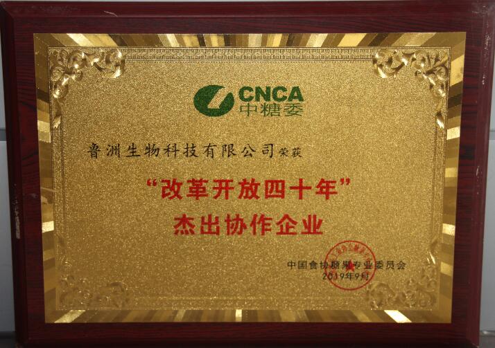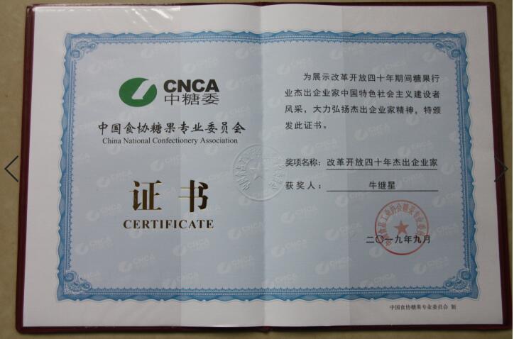 魯洲生物科技有限公司榮獲中國食協(xié)糖果專業(yè)委員會(huì) “改革開放四十年”杰出協(xié)作企業(yè),董事長牛繼星榮獲“改革開放四十年”杰出企業(yè)家。